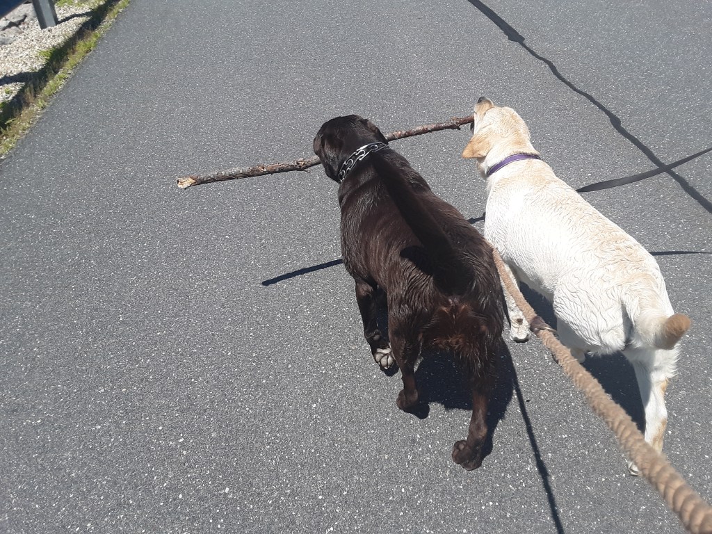 Tagged as #bffs #chocolatelabsquad, #ebonyandivory, #labradors, #mylifeinpictures #365daysofphotos, #sistersoftheheart, #waterdog
