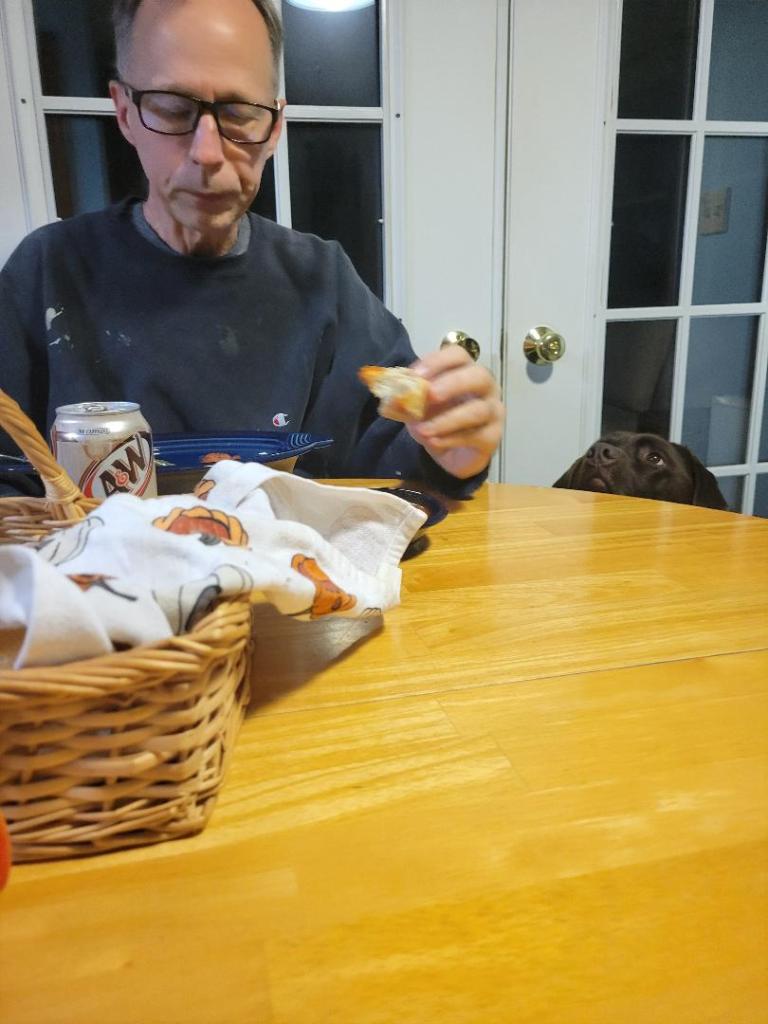 Looking longingly at daddy’s supper because she is on a diet and he is no longer allowed to give her stuff from his plate.