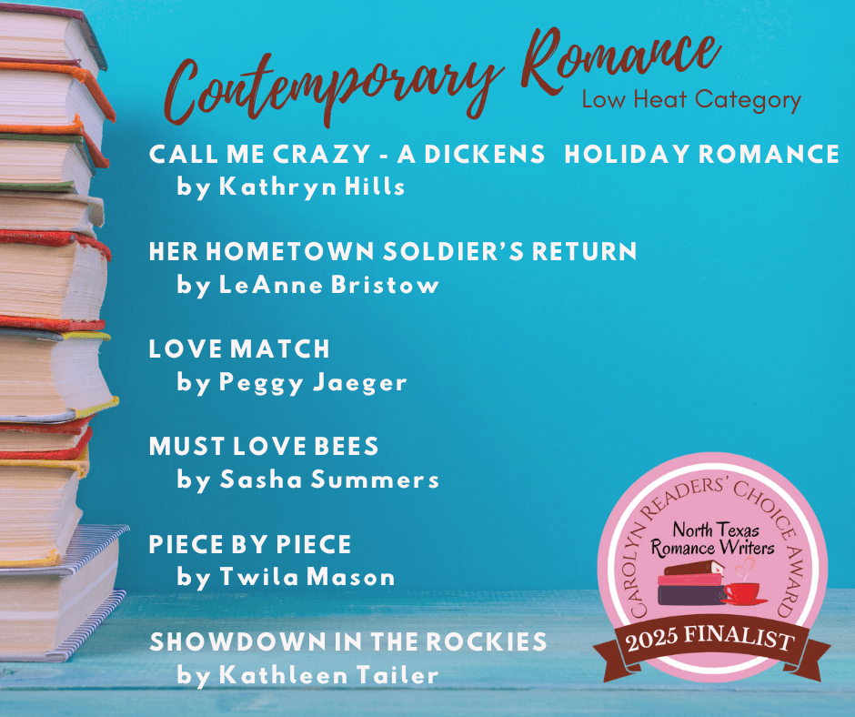 I was away all Easter weekend visiting with the grandkidlets, so I didn’t post anything to any of my socials, including here. But before I left for the holiday, I received a lovely email from the contest coordinator of the CAROLYN CONTEST, sponsored by THE NORTH TEXAS ROMANCE WRITERS. The email was to inform me that the second book in my HEAVEN’S MATCHMAKER series, LOVE MATCH, was a finalist in the contemporary category of the contest in the Low Heat division.
