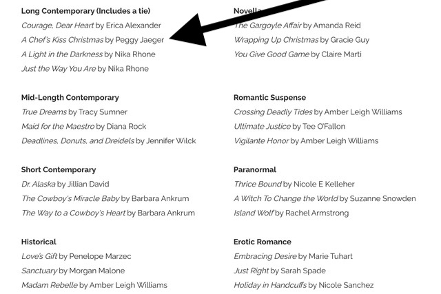 On April 18, the Golden Leaf awards will be announced. I am a finalist in the Long Contemporary category with my Dickens Holiday Romance A CHEF’S KISS CHRISTMAS