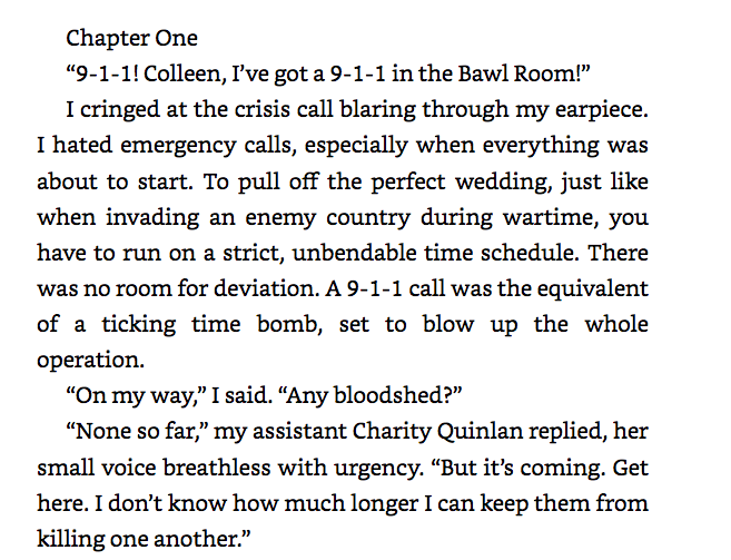 “Oh, good Lord. Thanks for the head’s up. I’ll make sure the moms are nowhere in sight when she gives them out. I don’t relish having to listen to one more complaint about this wedding. I’ve had enough for the past week to last me until junior here”—she patted her round tummy—“is off to college.”