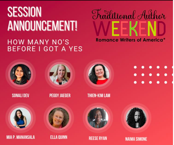 How Many Nos Before I Got a Yes Panelists: Sonali Dev, Peggy Jaeger, Thien-Kim Lam, Mia P. Manansala, Ella Quinn, Reese Ryan, & Naima Simone
