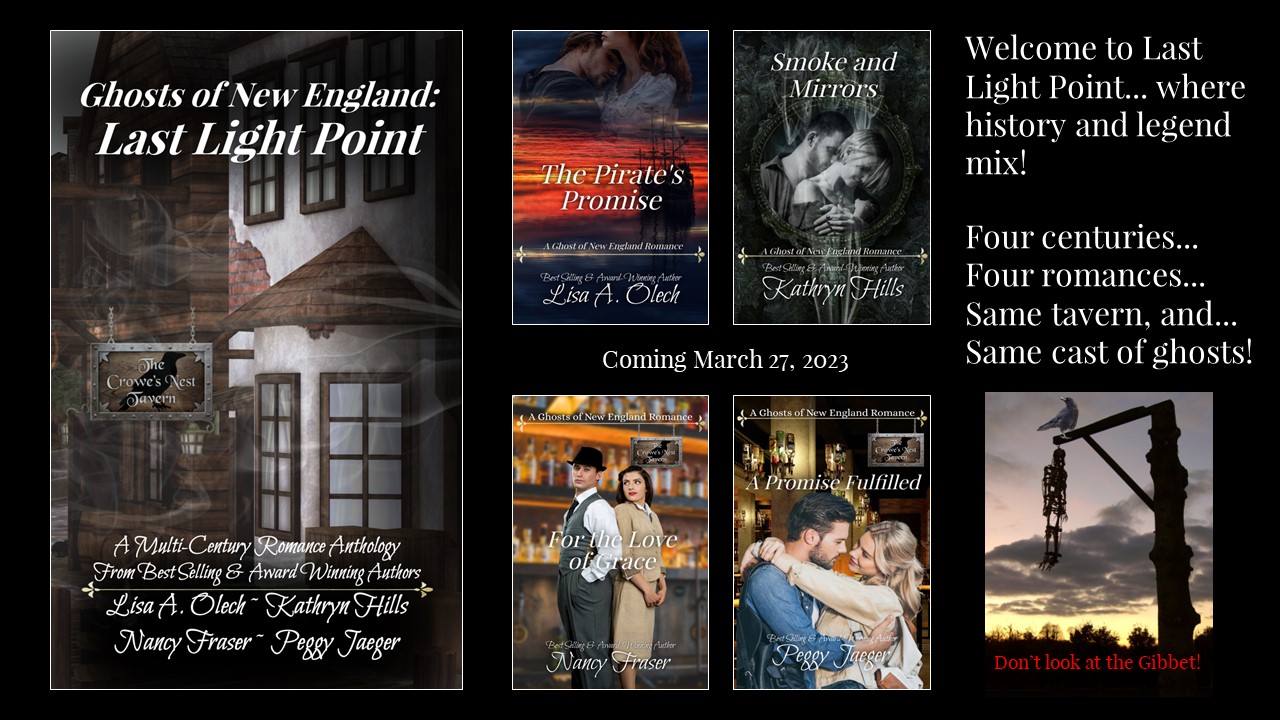Award-winning authors Lisa Olech, Kathryn Hills, Nancy Fraser, and moihave each written a story about the Crowe’s Nest Tavern, located in the fictional New England town of Last Light Point.