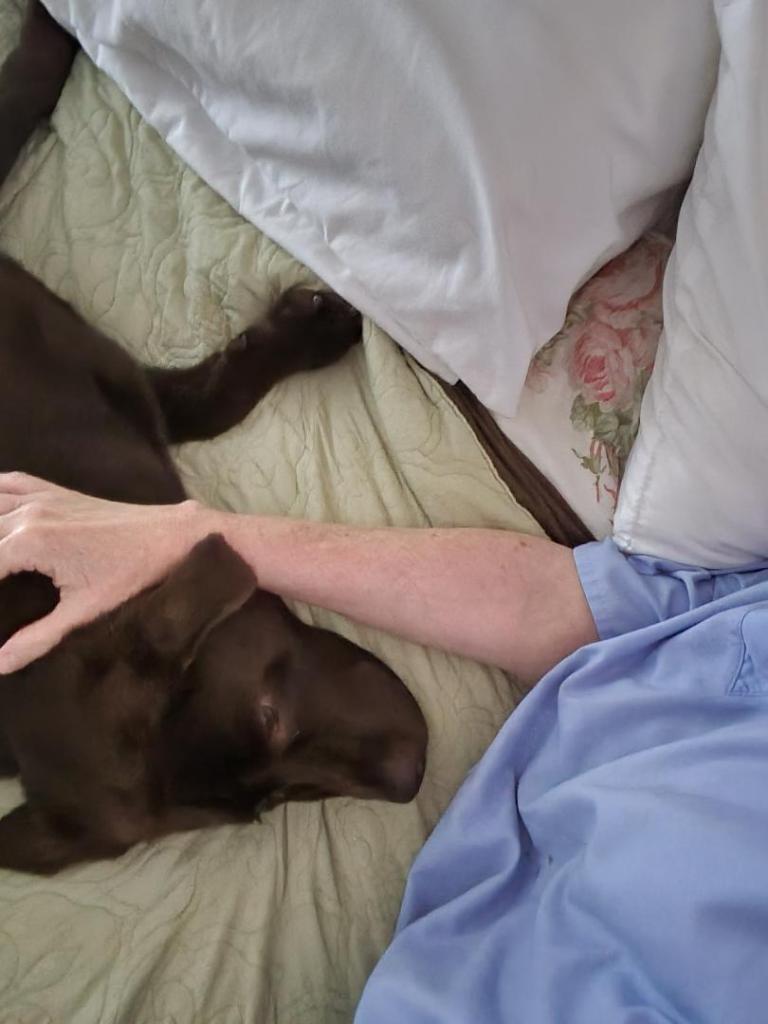 Post-Covid I nap a lot because I get tired. Maple is very supportive and never leaves my side.