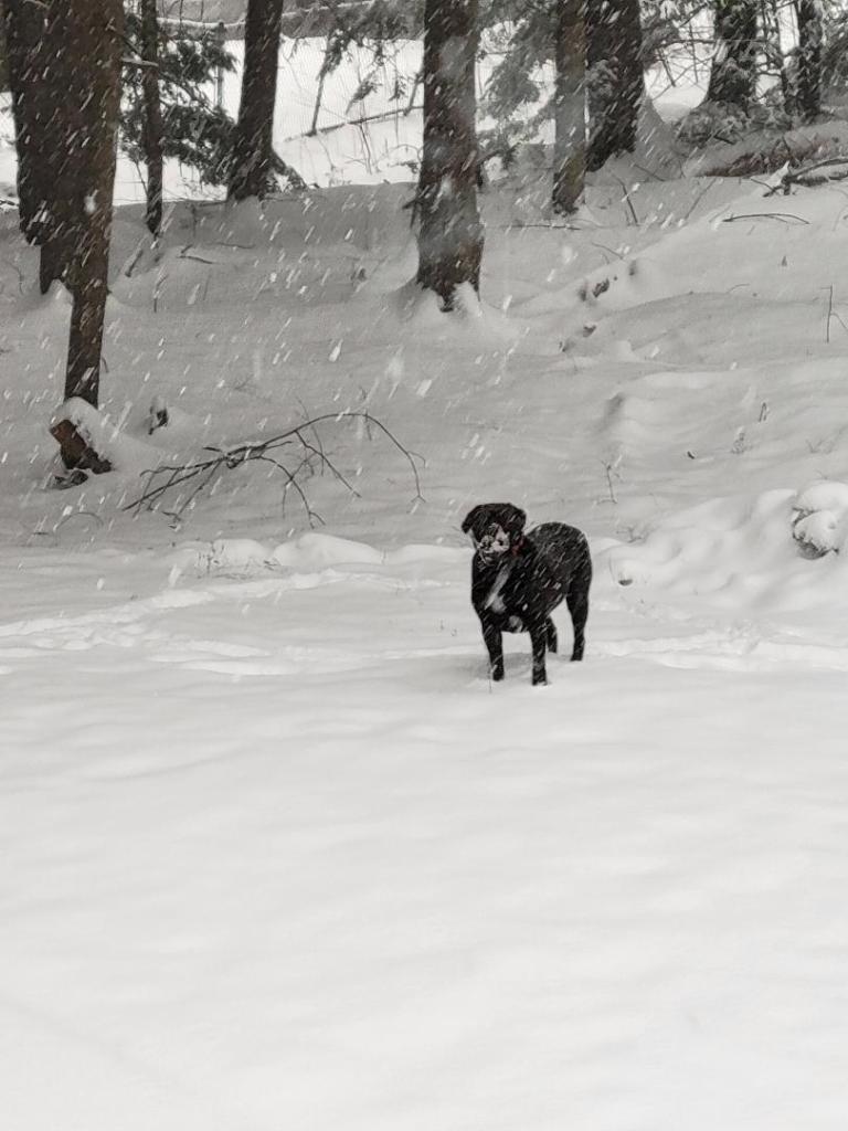 Just a dog, sitting in the snow, under a lamppost, making sure mommy is safe from murderous squirrels.