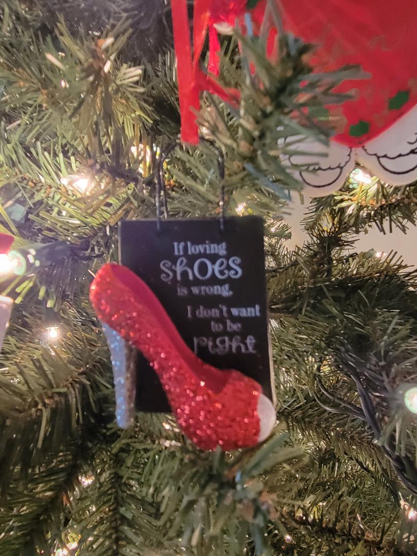 I remind you of this because of today’s ornament. Several years ago I went shopping with a friend to buy shoes for a wedding. I would up with three pair that day because I couldn’t make up my mind which would go best with the dress. I fully intended to return the two that didn’t.