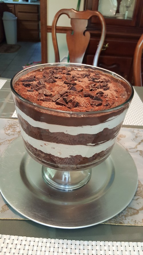 Once the cake is cooled and sliced, crumble one round and place it in the bottom of a trifle bowl. Press it down so the cake pieces cover the entire bottom of the bowl. Then, spoon in half the chocolate pudding, spreading it around the cake to form a layer ( refer to the picture above. ) Then spread a layer of cool whip -use about 1/2-2/3 of the tub. Again, refer to the above picture to see what it looks like.