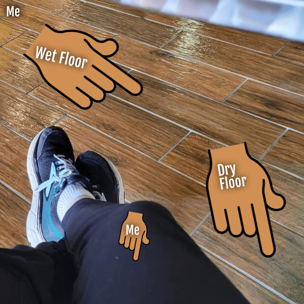 This is how she swabbed around me. Notice the floor next to me was never touched. If that had been me I would have asked the person to at least lift their feet so I could get under the table and chair.
