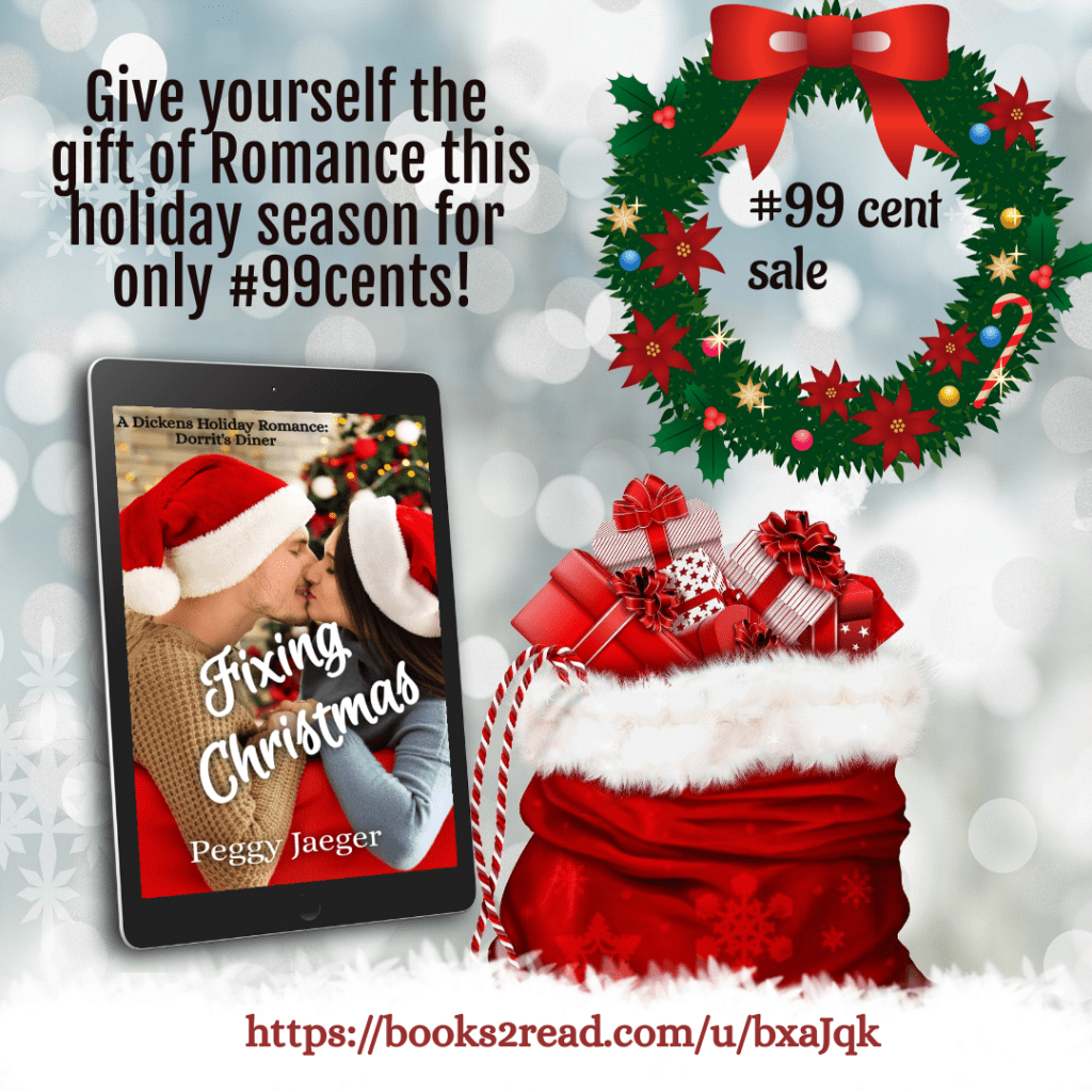 If you’re like me and hate to leave home on this busy, ridiculously busy day, I’ve got a deal for you and the book lovers on your holiday gift list – a #99cent sale on FIXING CHRISTMAS my latest Dickens Holiday Romance. Today it is available for a limited time at #99cents everywhere digital books are sold – Amazon, Nook, Applebooks, even Kobo.