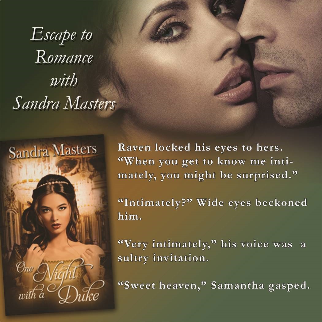 Today I’ve got a lovely treat. Wild Rose Press sistahs and author SANDRA MASTERS is visiting with one of the wonderful characters from her recent release,  ONE NIGHT WITH A DUKE.  Sandra and His Grace, Raven, Tenth Duke of Ravensmere sat down for this little tete-a-tete recently and both agreed to let me ( and you!) listen in. Sit back and enjoy and stick around because Sandra is giving us all a present: An excerpt from ONE NIGHT WITH A DUKE.