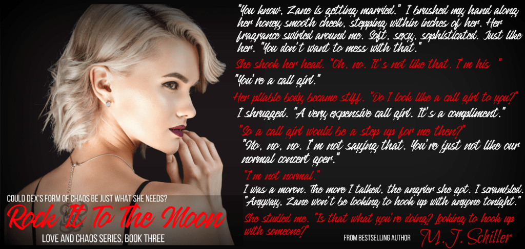 This is the very first time my new ROMANCE GEMS sistah, prolific author M.J. Schiller, has visited me and WOW! am I thrilled. She’s just had a brand new book release yesterday, book 3 in her LOVE AND CHAOS series ROCK IT TO THE MOON and man-oh-man does this book ( and the series ) look fabulous! The cover alone is enough to get me all hot and bothered!