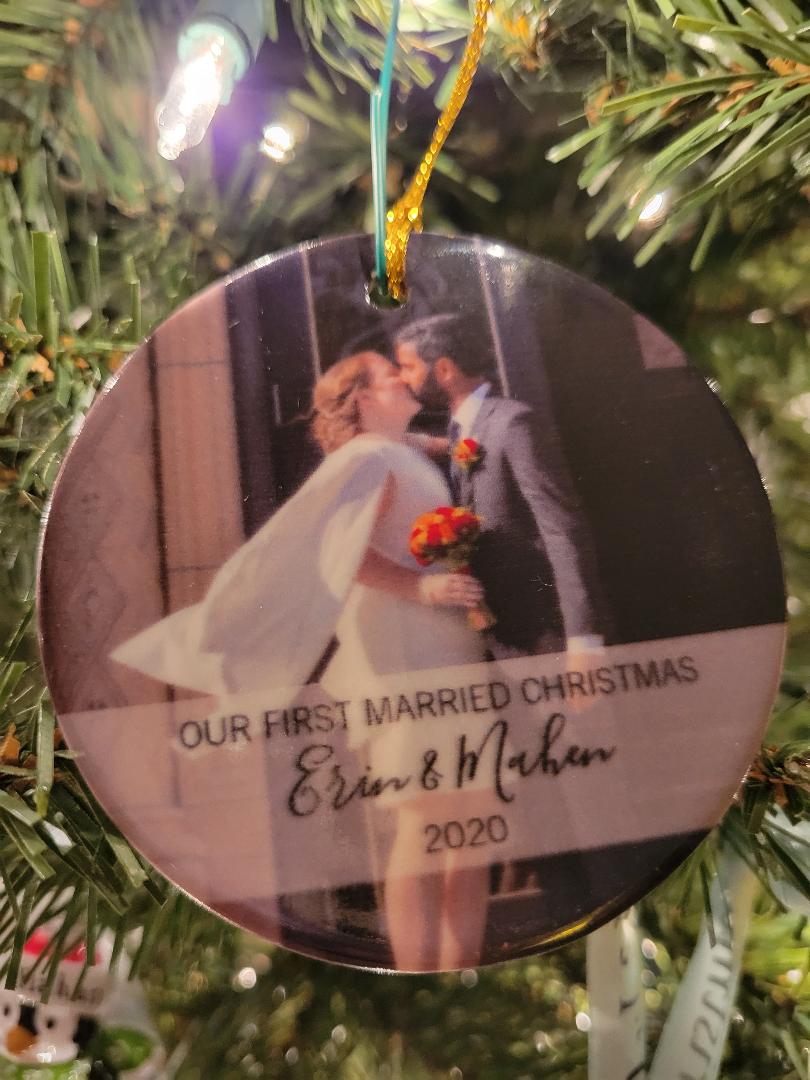 The second ornament is from last year. After delaying their wedding for a year due to Covid, and then realizing they might have to do so again for another year, they decided to just simply take the plunge. It was a glorious day in September when they pledged themselves together for life, and were surrounded by family – all masked – in her hubby’s home church.