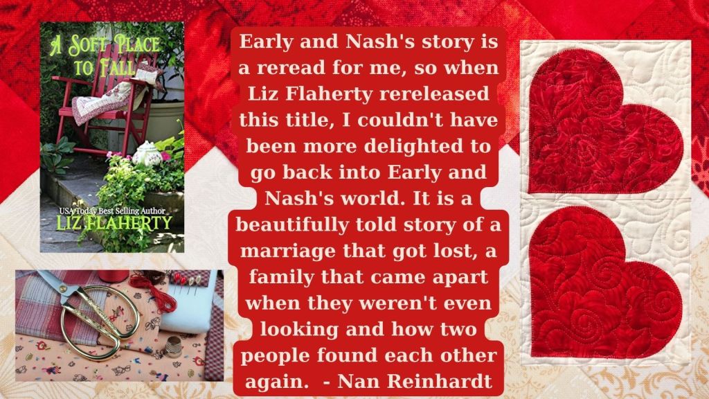 Divorced and in search of herself, Early moves back to the Ridge in rural Kentucky. She takes care of Nash’s father after he has heart surgery, of her mother when she breaks her ankle, and…finally…of herself, too. As she builds a quilt shop named A Soft Place to Fall, she also creates a life for herself.